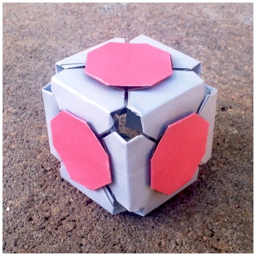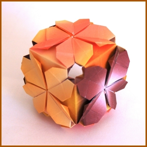 ![]() Inspired by Fumiaki Shingu's Heart Sonobe and Francis Ow's Love Cube. Two 24-unit assemblies: colored centers (left and inset) and colored corners. |